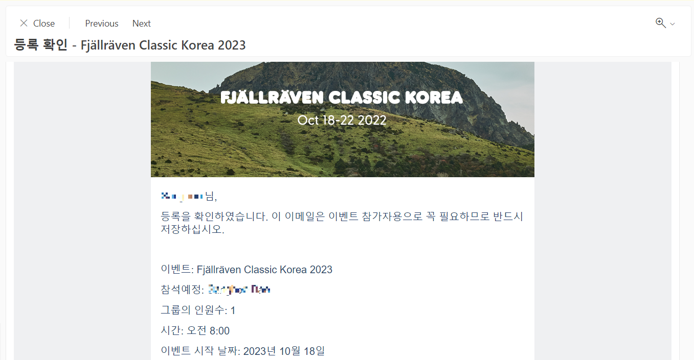 카드 번호를 모두 적고, 결제까지 끝내야 클래식 코리아 등록 완료이기 때문에 미리 카드 번호도 모두 등록해 놓는 것을 추천한다. 게다가 가능한 카드를 외화 결제 가능하게끔 미리 준비해 두는 것을 추천. 2023년의 경우, 올해 환율이 많이 올라 1인 결제 금액 230달러, 실결제금액으로 약 31만 원 지출했다. 그래도 안전이 확보된 행사에, 멋진 풍경 속에서 걸을 수 있다는 것이 너무 행복한 일이기 때문에 즐겁게 사용할 수 있었다. 갈 생각 하니 기분 최고다!!