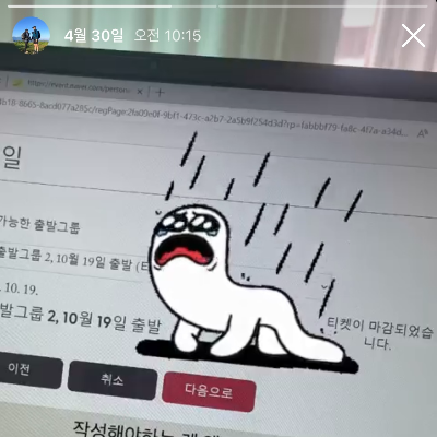 티켓 마감 시 왼쪽 이미지를, 티켓 등록에 성공할 경우는 오른쪽의 이미지(메일 확인)를 보실 수 있다. 4월 30일에 속상한 마음으로 인스타그램(@ourweeek) 스토리에 올린 이미지를 이렇게 포스팅에 활용할 줄이야.. 결국에 성공해서 다행.