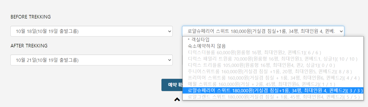 - 선택 사항: Before(트레킹 전 숙박) 또는 After(트레킹 후 숙박)